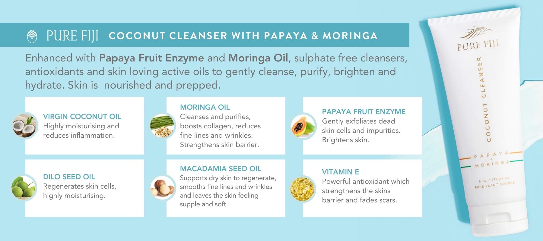 A luxurious cleanser with creamy coconut and purifying moringa oil to gently remove makeup, excess oil and pore-clogging impurities – without stripping the skin of essential moisture. This unique cleanser is boosted with papaya extracts to brighten skin tone while moringa and dilo extracts purify and restore skin to a healthy balance.