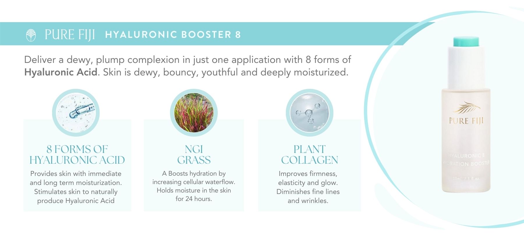 Drench your skin in moisture with this next generation supercharged Hyaluronic Booster 8. This lightweight formula is enriched with 8 targeted forms of skin- loving hyaluronic acid, plus hydrating Ngi Grass and Plant Collagen, plumping the skin’s surface in seconds! With continuous application Hyaluronic Booster 8 can stimulate skin to produce more hyaluronic acid for deeper moisturisation and younger looking skin!