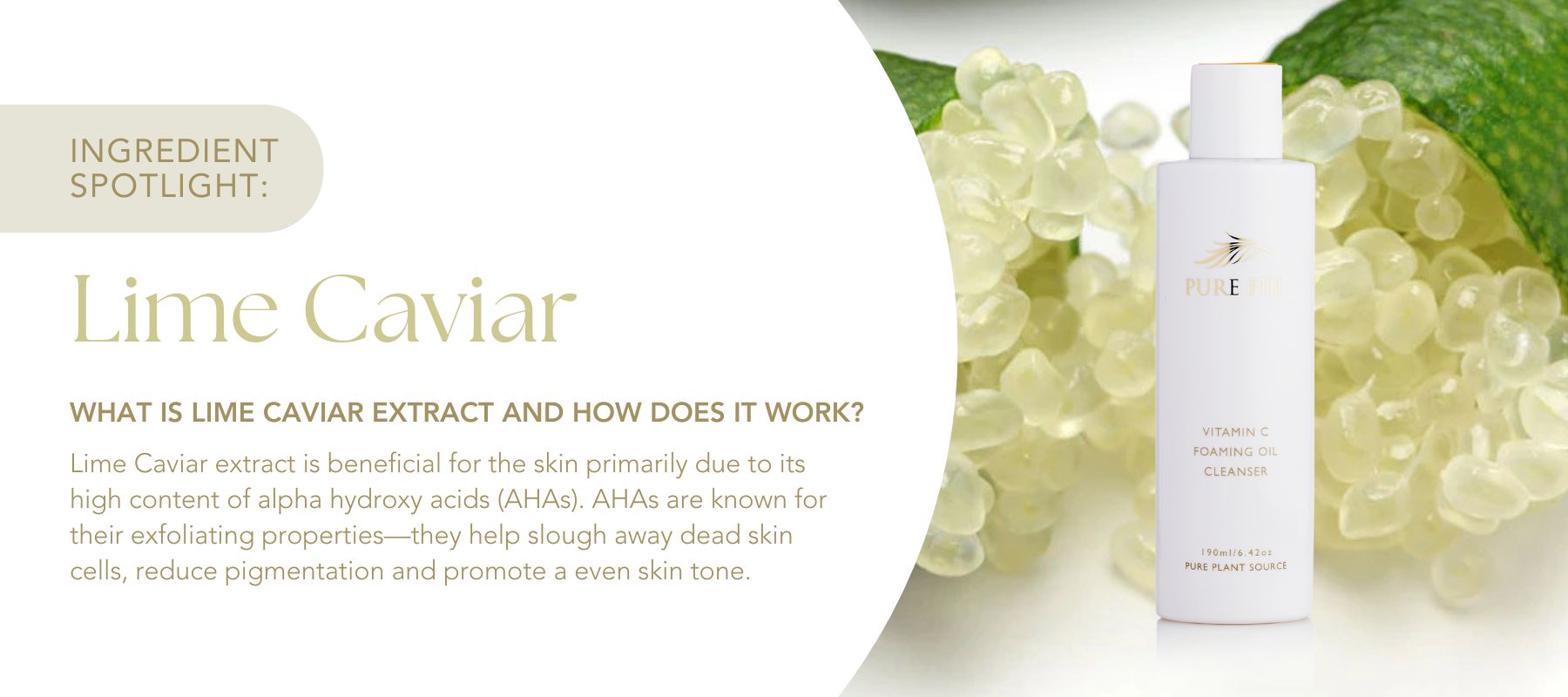 MICROCITRUS AUSTRALASICA (LIME CAVIAR) FRUIT EXTRACT - Lime contains a high concentration of Vitamin C, which helps to increase collagen production tighten skin. High in antioxidants and antimicrobial properties. Lime extract helps to lighten skin pigmentation, prevent dark spots on skin and exfoliate dry, dull skin leaving it glowing.