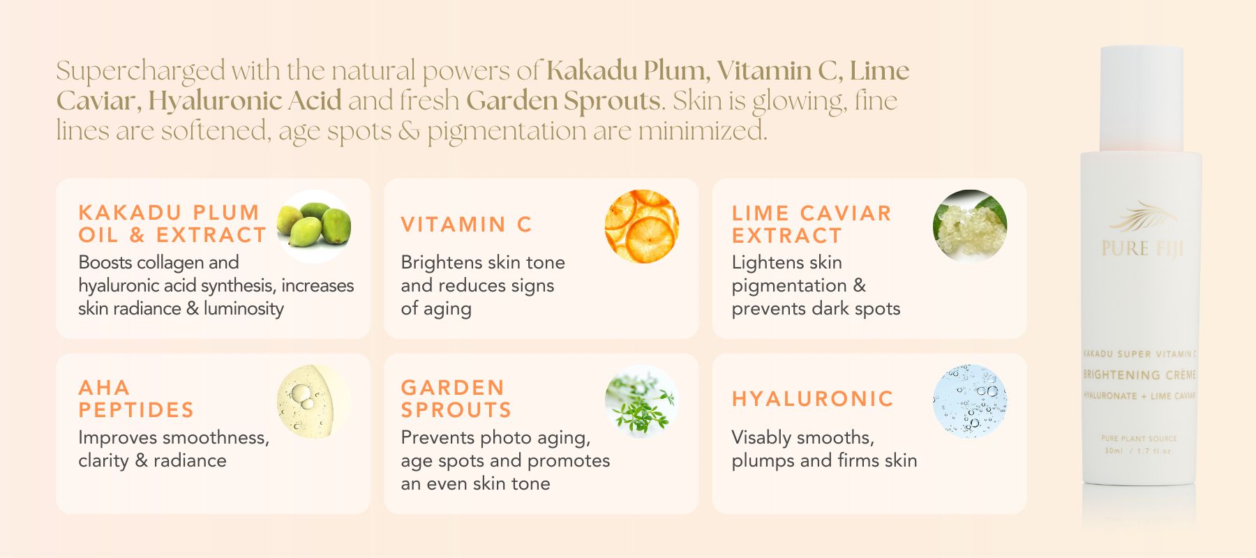 Brighten and smooth skin with this powerful blend of pure Vitamin C and lime caviar combined with skin-smoothing peptides, Dry, dull skin will be smoothed away while extracts of fresh garden sprouts diminish age spots and pigmentation.